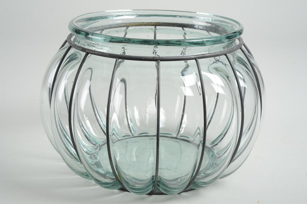From the Tea Garden Collection This over-sized clear glass candle holder has a subtle blue tint and features charcoal gray metal lined ridges Holds (1) pillar candle - not included 100% recycled glass Hand-made in Spain Dimensions: 7.5" high x 10.25" diameter Material(s): glass/metal