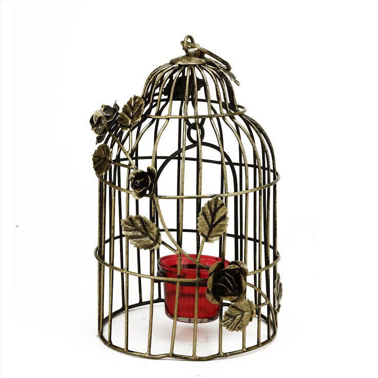 This birdcage shaped tealight candle holder evokes thoughts of summertime romance and would make a charming addition to any decor Accented with rose flowers climbing up the sides Features a brushed metal antique gold finish Holds (1) votive or tealight candle (not included) Comes with (1) red glass tealight holder Recommended for indoor use - if using outdoors, place under a covered area Dimensions: 10" high x 7" diameter Material(s): metal/glass