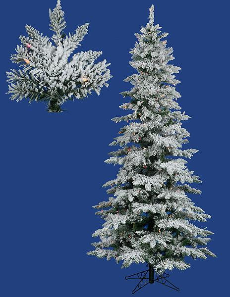 Tree features two-tone green perfectly tapered tips that are accented with snow-like flocking Stepped layers provide the canvas for dramatic decorating Out swept silhouette Product Features: Pre-lit with 700 multi-color LED lights Multi-color consists of red, amber, green, blue, purple, pink and warm clear bulbs Bulb size: mini 1,743 tips Slim profile tree Hinged branch construction Additional Product Features: LED lights use 90% less energy Durable non-glass replaceable bulbs Cool to the touch If one bulb burns out, the rest stay lit Tree come in multiple sections for easy assembly Light sets on tree are UL listed for indoor or outdoor use, however the tree itself is recommended for indoor use Comes with replacement bulbs and spare fuses Comes with a FREE black metal tree stand Dimensions: 10' high (from the base of stand to the top of the tree) 55" base diameter (at the widest point) Material(s): PVC/plastic bulbs/flocking/metal/wire