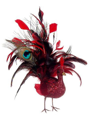 From the Regal Peacock Collection Item #BB6780-RE Peacock's tail features gorgeous natural feathers and brilliant multi-tonal red feathers This glitter drenched peacock has 2 flexible metal wires attached to its feet for easy and subtle attachment to your holiday decor Perfect for attaching to your Christmas tree, wreath, garland, floral arrangement or centerpiece Dimensions: 10"H x 2"W x 3"D Material(s): foam/feather/plastic/glitter/metal