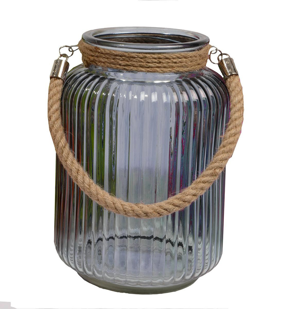 From the Tropicalia Collection Transparent blue-gray candle holder jar is accented with a jute wrapped lip Holds (1) pillar candle (not included) Jute handle for carrying or hanging Recommended for indoor use Dimensions: 10"H x 6"W x 6"D 17.5"H (including handle) Material(s): glass/metal/jute