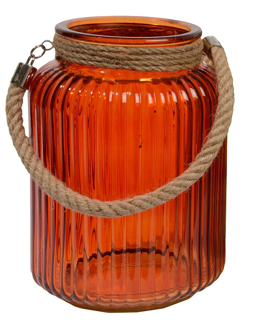 From the Tropicalia Collection Transparent orange candle holder jar is accented with a jute wrapped lip Holds (1) pillar candle (not included) Jute handle for carrying or hanging Recommended for indoor use Dimensions: 10"H x 6"W x 6"D 17.5"H (including handle) Material(s): glass/metal/jute