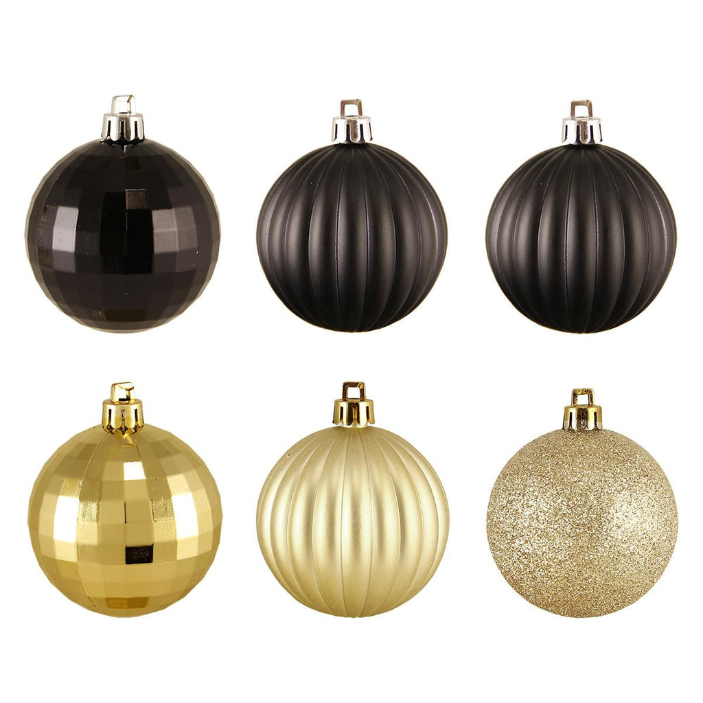 100-piece set Color: Jet black/Vegas Gold Product Features: These dazzling ornaments are done in 3 amazing finishes: shiny mirror ball, matte ribbed and glitter This special club pack will allow you to build your collection quickly and decorate with more possibilities Shatterproof ornaments combine the beauty and luster of real glass with the unbreakable practicality of plastic Balls are equipped with silver or gold ornament caps Dimensions: 2.5" (60mm) diameter Material(s): plastic