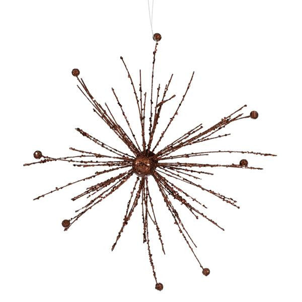 12 Inch Starburst Ornament Item #P105515 This ornament is a glimmering brown with ball accents and two sizes of glitter for ultimate sparkle: small glitter for a sheen and large glitter for a pop of shine Fully dimensional ornament Comes ready-to-hang on a gold cord Dimensions: 12"H x 12"W x 2"D Material(s): plastic/foam/glitter