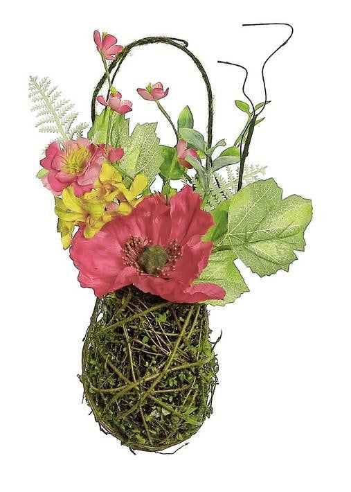 This beautiful hanging basket would make a wonderful addition to your spring and summer wall decor Features red poppies with orange and pink wildflowers Accented with mixed ferns and foliage Basket is cylindrical Comes ready to hang on a wire frame Recommended for indoor use Dimensions: 12"H x 5"W x 4"D Material(s): PE/fabric/metal
