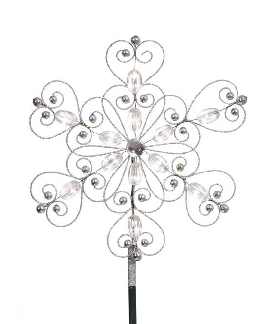 Silver beaded snowflake accented with sparkling glitter and a faux gem in the center Features: Color: warm clear bulbs / green wire "Warm clear" also known as "warm white" has a nice natural warm incandescent candle-like glow Number of bulbs: 18 Bulb size: micro LED One-sided design 8' green lead cord Additional Product Features: LED lights use 90% less energy Super bright bulbs UL listed for indoor use only Non-replaceable bulbs Includes a green metal stake with 2 hook and loop straps for easy attachment to your tree AC adapter included Adapter input: 120 volts, 60 hertz, .2 amps, 24 watts Adapter output: 3 volts, .5 amps Cannot be connected to other lighted items Dimensions: 12"H x 11"W x 1"D Material(s): plastic/wire/metal