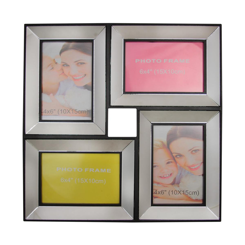 Display your favorite pictures with this 4-opening wall frame Features a dual-sized frame collage with each opening encased with mirror, trimmed in black Collage can hold 2 - 4"x6" and 2 - 6"x4" photos Can be hung horizontally or vertically Includes hanging hardware Dimensions: 13.75"H x 13.75"W x 1"D Material(s): plastic/glass