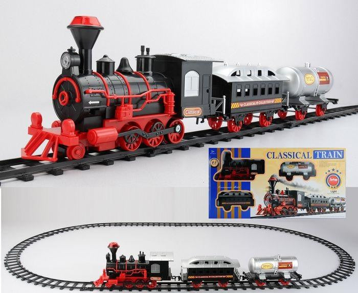 Watch this delightful 13-piece train set circle around your Christmas tree Track can be configured in either a round or oval shape Recommended for ages 3+ Product features: Makes realistic train sounds Locomotive features a working head light 10 pieces of track for a total of over 10 feet Includes 6 curved and 4 straight track pieces Convenient on/off switch Requires 4 "AA" size batteries (not included) Some easy assembly required Dimensions of train cars: Locomotive: 5"H x 9.25"L x 3"W Chemical tanker: 3.75"H 8"L x 2.25"W Passenger car: 3.5"H x 8"L x 2.25"W Material(s): plastic