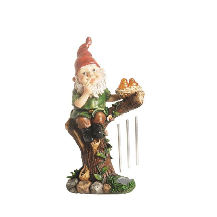This beautiful solar powered garden statuary with wind chime is the perfect way to enhance your outdoor areas Meticulously sculpted by highly skilled artisans with fine attention to detail Features a cute forest gnome sitting upon an old tree trunk with a floral creeping vine running up the side of the trunk Nested birds, set upon the tree branch, are lit by a single amber LED light Silver wind chimes hang from beneath the tree branch Additional Product Features: Solar powered light automatically turns on at night or in the dark and turns off during the day Must be placed in an area that receives full sunlight Solar panel is located at the base of trunk On/Off button located on bottom of statuary For outdoor use Approximate Dimensions: 15.75"H x 8"W x 5.5"D Material(s): polyresin