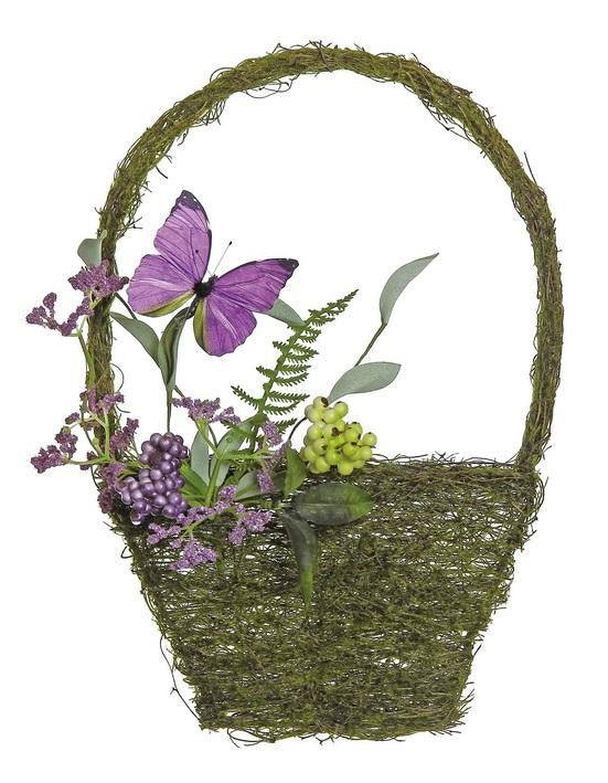 A purple butterfly is featured on this charming purple and green berry with mixed foliage basket wall decoration Accented with a moss texture on the basket Comes ready to hang Recommended for indoor use Dimensions: 15"H x 10"W x 2.5"D Material(s): PE/foam