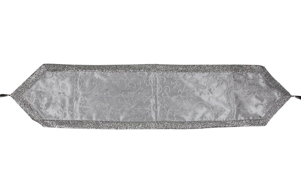 Table runner has a sheer overlay that features a glittery silver flourish design with a silver metallic border and tassels at each end One-sided design Care instructions: spot clean only Dimensions: 76" long x 16" wide (72" long without tassels) Material(s): polyester