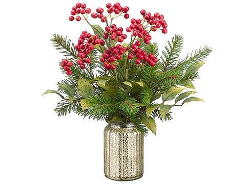 Bring a festive holiday look to your Christmas decor with this decorative floral arrangement Floral arrangement features red berries, green pine tree needles and beech tree leave that come in a glass vase Vase has the look of mercury glass Recommended for indoor use only - or underneath a covered are Dimensions: 17.5"H x 10"W x 11"D Material(s): glass/polyester/foam/PE needles