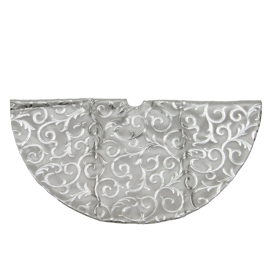 Tree skirt has a sheer overlay that features a shiny silver flourish design One-sided design Closes in the back with (2) hook and loop fasteners Care instructions: spot clean only Dimensions: 20" diameter Material(s): polyester