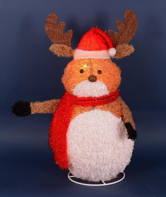 Adorable reindeer dons his favorite red scarf and Santa hat Product Features: Pre-lit with 25 clear lights Bulb size: mini 36" white lead cord Easy assembly required Additional Product Features: UL listed for indoor/outdoor use Plug contains one end connector which allows you to stack decorations together (not to exceed 210 watts) Comes with white metal stand, spare fuse and replacement bulbs Dimensions: 24" high Material(s): chenille/metal/glass bulbs/wire