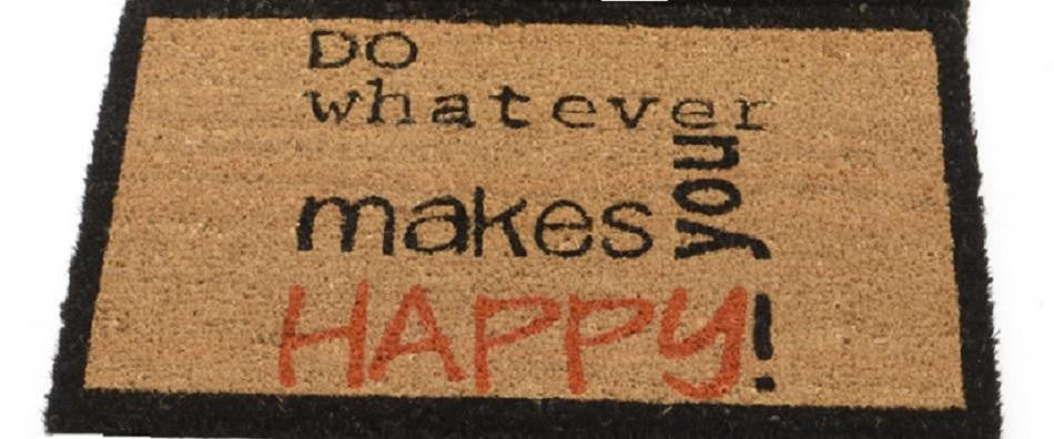 From the Basic Luxury Collection This door mat offers some priceless advice stating to "Do whatever makes you happy!" Whimsically arranged black and red text is on a natural brown background with a black border Ideal for indoor or outdoor use Dimensions: 24"L x 16"W x .5"H Material(s): natural coir fibers/ rubber backing