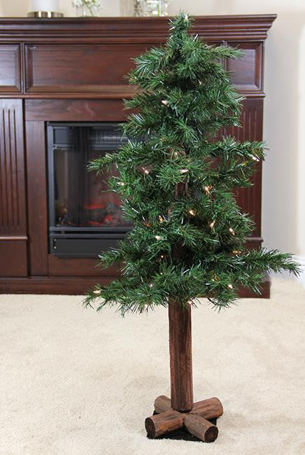This Alpine tree is full of woodland charm and features dark green 2 inch wide tips that sit on a realistic wood trunk Product Features: 130 branch tips Pre-lit with 50 clear mini lights If one bulb burns out, the rest will stay lit Hinged branch construction No assembly - tree comes in one piece Light sets on tree are UL listed for indoor or outdoor use, however the tree itself is recommended for indoor use 26 inch green lead cord Comes with spare replacement bulbs and fuses 120 volts, 60 hertz, 0.17 amps, 20.4 watts Dimensions: 3' high (from the base of stand to the top of the tree) 21" base diameter Material(s): PVC/metal/glass bulbs/wire/wood