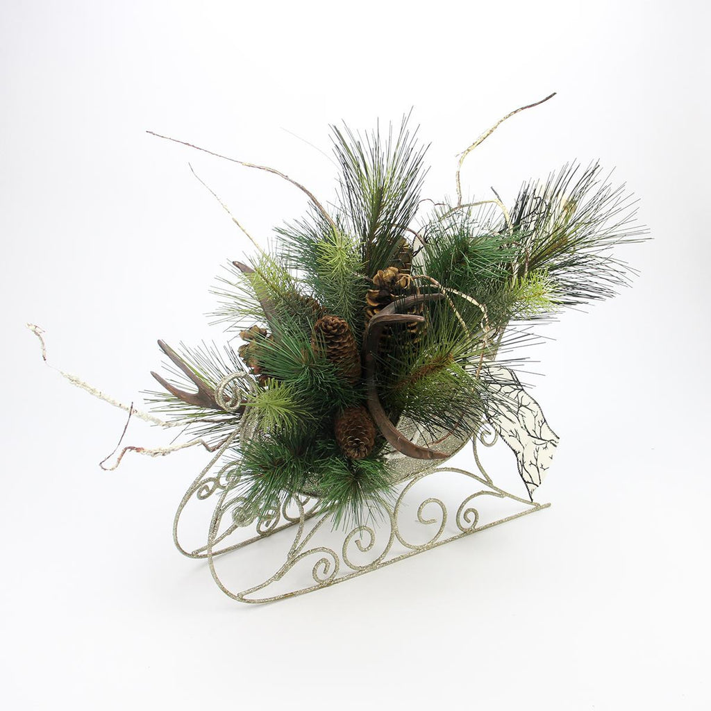 Decorative table top sleigh is embellished with gold and iridescent sparkling glitter Sleigh is decorated with assorted pine branches, frosted twigs, birch branches, pine cones, brown antlers and a glittered cream and gray branch pattern bow Due to the handcrafted nature of these items, the design may vary slightly for each item Dimensions: 20"H x 31"W x 23"D Material(s): metal/PVC/plastic/wood/foam