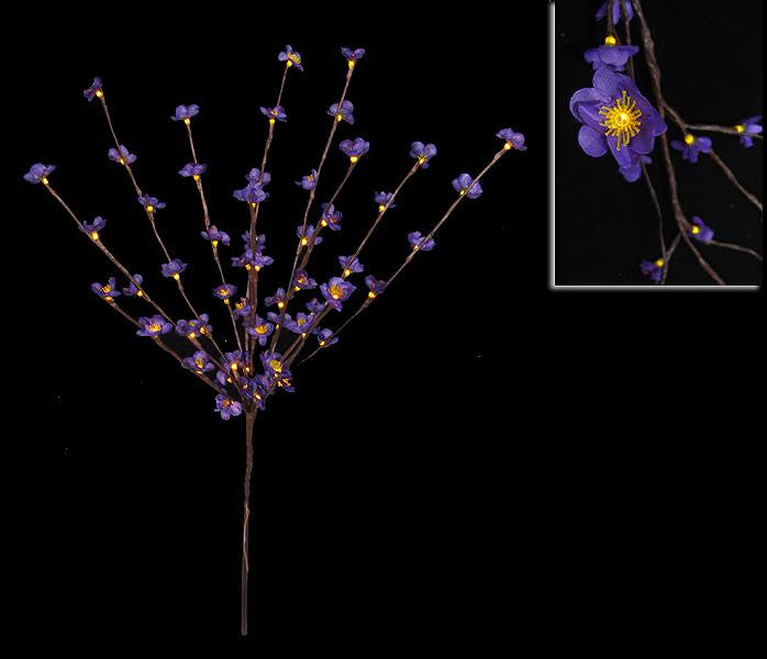 Lighted Branch Spray Item #1105-111 Features: Pre-lit with 60 lights Bulb color: clear (looks like a soft candle light glow) Bulb size: micro Flower color: purple Lighted accessory has about 12 various sized stems that come together and connect at the bottom to form 1 branch Hand wrapped stems Lights can be used alone or added to enhance floral arrangements Branches are bendable to help accommodate your decorating needs Additional product features: UL approved for indoor use only Black adaptor included Adaptor input: 120VAC, 60Hz, .28 amps Adaptor output: 24VAC, 300mA Class 2 power supply Brown lead cord is approximately 10 feet long Cannot connect multiple stems together, each will require their own power source Flower dimensions: 1.5 inch diameter Stem dimensions: 19 inches long Flowering stems: 17 inches long Total branch length: 36 inches long Material(s): polyester flowers/glass bulbs/plastic/various man made materials