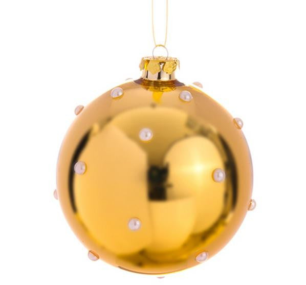 From the Glamour Time Collection This stunning shiny gold glass ball ornament is beautifully embellished with faux white pearl beads Perfect addition to your gold themed Christmas tree decor Fully dimensional ornament Comes ready-to-hang on a gold ribbon Dimensions: 4.75" (121mm) diameter Material(s): glass