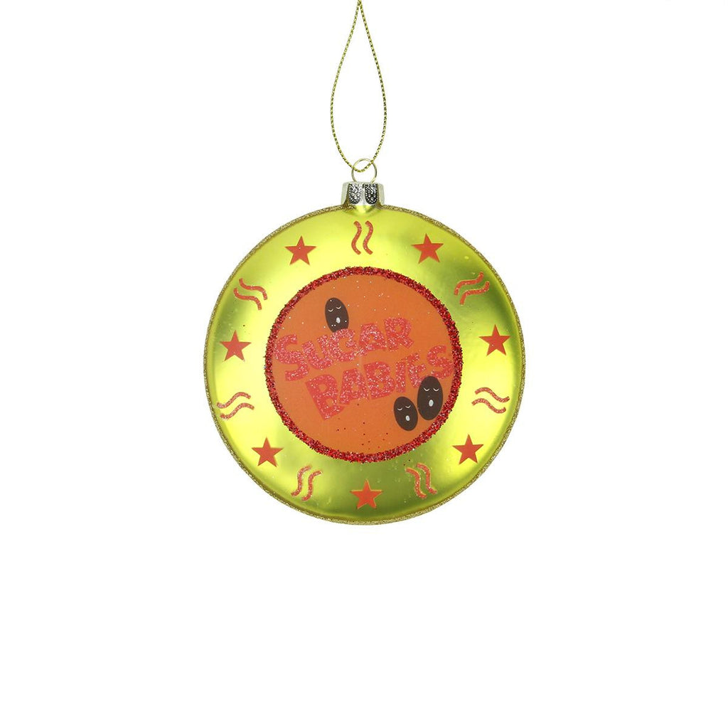 From the Candy Lane Collection Officially licensed merchandise Tootsie Roll offers a perfectly-balanced cocoa taste, lined with a subtle, fruit-flavored undertoneâ€"all incorporated into a delicious treat Features the phrase Sugar Babies with star and candy accents Embellished with glitter for some sparkle and pizzazz Double-sided ornament Comes ready-to-hang on a gold cord For decorative purposes only Dimensions: 4"diameter Material(s): glass