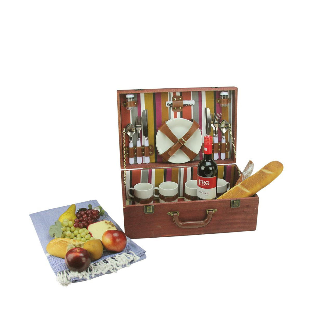 4-Person Hand Wooden Red Striped Picnic Basket Set with Accessories