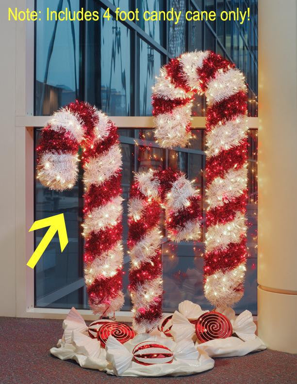 4 Foot Pre-Lit Tinsel Candy Cane Christmas Yard Art Item #100039345 Features: Pre-lit with 200 red and clear mini lights If one bulb burns out, the rest will stay lit 3-piece easy assembly (including stand) ETL listed for indoor/outdoor use 70 inch red and white lead cords Comes with spare replacement bulbs and fuses Includes green metal tree stand and lawn stakes Dimensions: 4 feet high (including stand) 18 inches wide (at widest point) Material(s): PVC/metal/glass bulbs/wire
