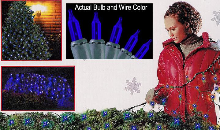 Set of 150 Net-Style Christmas Lights Item #292M4411 The FAST & EASY way to decorate trees and more in just minutes, simple and easy to use! Features: Color: blue bulbs / green wire Number of bulbs on string: 150 Bulb size: mini Spacing between each bulb: 5 inches Dimensions: 4 feet x 6 feet Total lighted area: 24 square feet 24 inch green lead cord Additional product features: If one bulb burns out, the rest will stay lit UL listed for indoor/outdoor use End-to-end connectors allow you to connect multiple sets of these lights together (not to exceed 210 watts) Wire gauge: 22 Comes with replacement bulbs and fuses 120 volts, 60 hertz, 0.51 amps, 61.2 watts