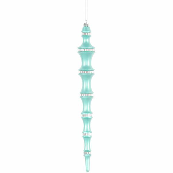 Blue Shatterproof Icicle Christmas Ornament Pack Item #O120832 4-piece set Color: baby blue Finish: matte These dazzling icicle finial ornaments are ribbed and accented with reflective mirror pieces Shatterproof ornaments combine the beauty and luster of real glass with the unbreakable practicality of plastic Each comes ready-to-hang on a silver cord Dimensions: 12 inches high x 1.5 inch diameter Material(s): plastic Pack includes 4 of the ornament shown