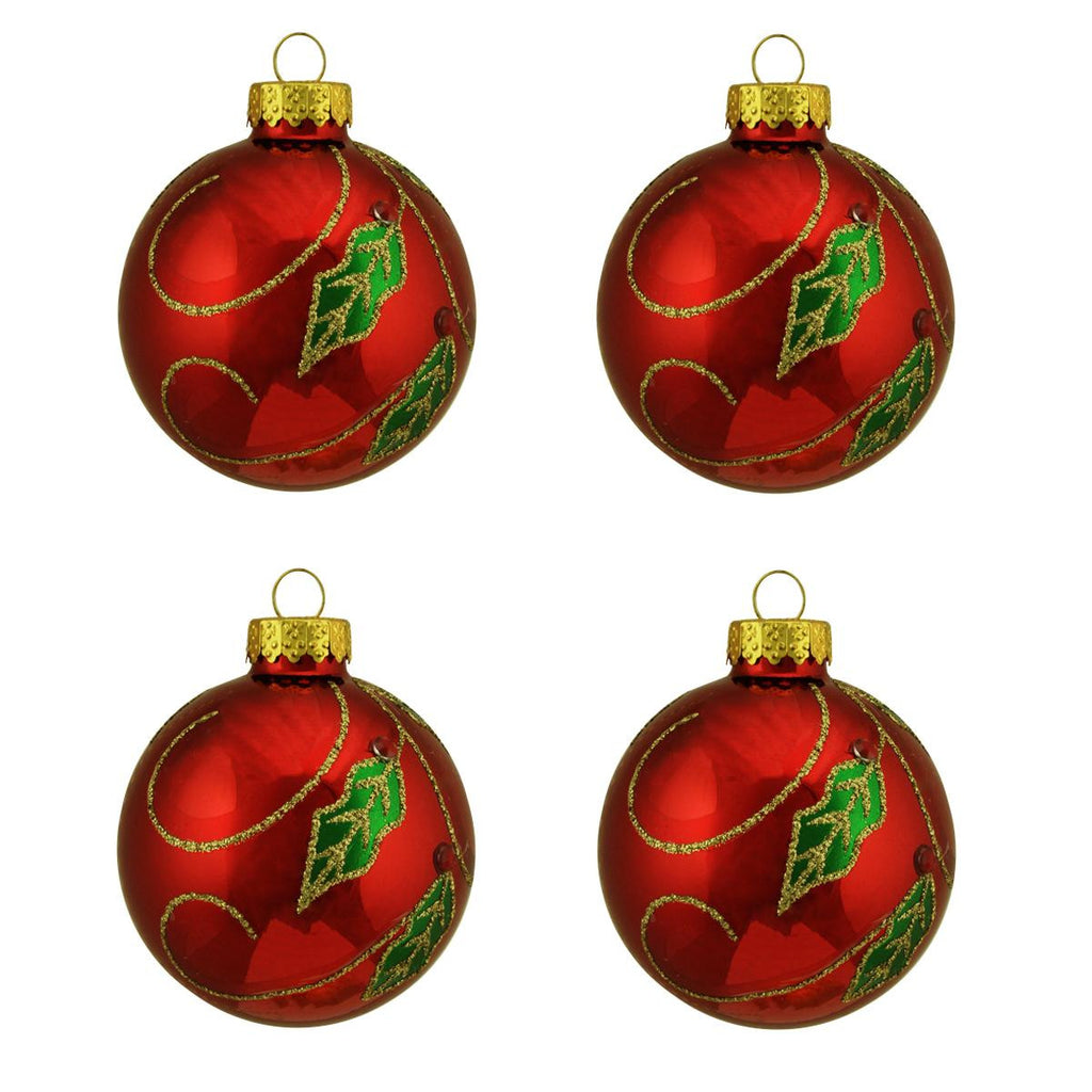 4-piece set Color: red Finish: shiny Decorated with green and gold glitter holly accents and red beaded gem berries This special club pack will allow you to build your collection quickly and decorate with more possibilities Balls are equipped with gold ornament caps (ornament hooks are not included) Dimensions: 2.5" (65mm) diameter Material(s): glass/metal hanger