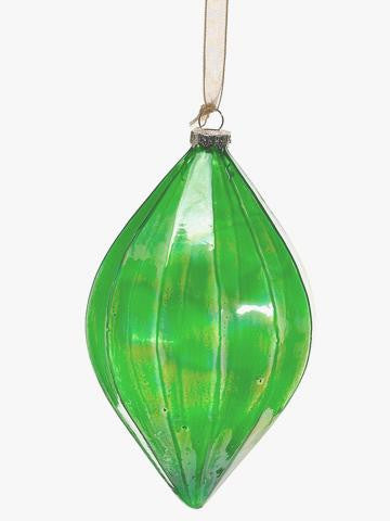 From the Princess Garden Collection Item #XGM068-GR/IR Beautiful, exclusively designed iridescent green finial shaped ornament is perfect to enhance any of your holiday decor! Comes ready-to-hang on a sheer gold ribbon Fully dimensional ornament Dimensions: 5.5" high x 3" wide (at widest point) Material(s): glass