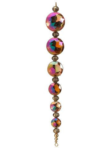 From the Regal Peacock Collection Item #XN7010-GO/IR This spectacular ornament features alternating gold beads and gold iridescent jewels that cast tones of blue, green, and purple Fully dimensional ornament Ornament comes ready-to-hang on a clear cord Dimensions: 6.5"H x 1"W x 0.5"D Material(s): plastic/wire