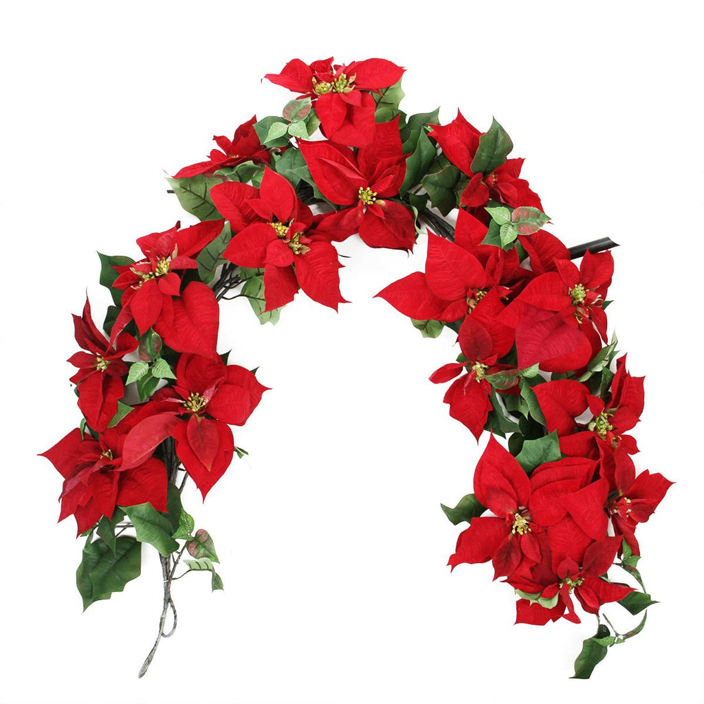 Features realistic velvet feel red poinsettia flowers and two-tone green leaves, resting atop a life-like branch base Unlit Comes with hooks on each end for easy hanging For indoor use only Dimensions: 6' long x 16" wide Material(s): polyester/plastic