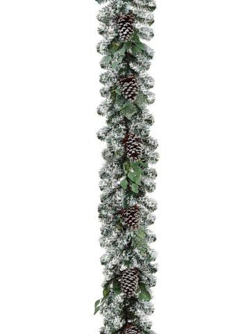 Flocked Pine Cone and Eucalyptus Christmas Garland Item #YGX278-GR/SN Garland features a lush arrangement of heavily flocked and glittered artificial evergreens accented with eucalyptus sprigs and pine cones Unlit Bendable wire center allows for you to shape the garland anyway you desire Dimensions: 6 feet long x 12 inches wide Material(s): PVC/plastic/pine cones