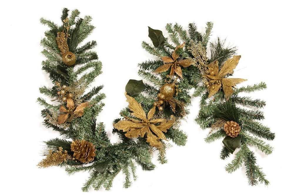 Artificial pine garland is pre-decorated with gold poinsettia flowers and gold glittered leaves, pine cones, berries and pomegranates Features a realistic mixture of 5" and longer 6" green tips in 3 different shades for extra dimension and depth Product Features: Unlit Bendable wire center allows for you to shape the garland any way you desire Green metal hooks on each end for easy hanging Recommended for indoor use - if using outdoors place under a covered area Dimensions: 6' long x 12" wide Material(s): PVC/plastic/metal