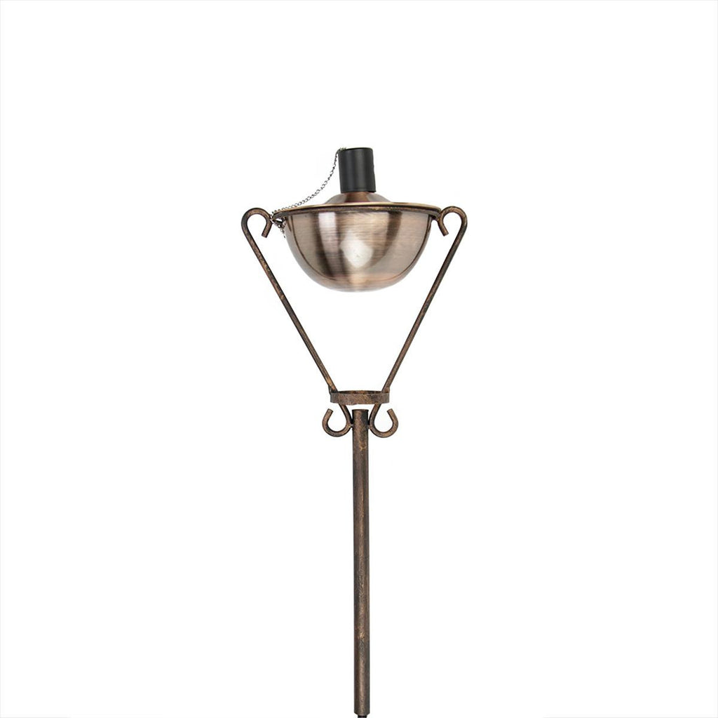 Large half-moon shaped brushed copper oil holder sits in a distressed copper holder Includes long-lasting fiberglass wick and black metal snuffer Stakes directly into the ground For outdoor use only Dimensions: 61"H x 8.75"W Material(s): iron/metal Note: oil is not included