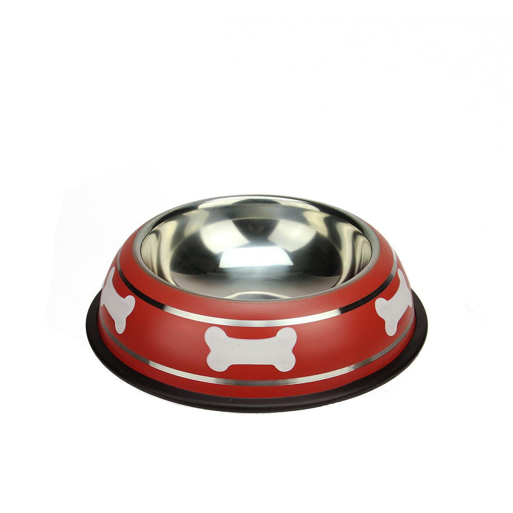 Serve a delicious meal to your puppy in style with this stylish bowl that features a white dog bone print to let everyone know it belongs to your best furry friend!! The stainless steel bowl provides super durability with non-slip strips to prevent movement pet feeding time jobs, a classic and practical pet bowl and is easy to clean For indoor or outdoor use with a small dog Can be used for food or water Dimensions: 2"H x 7"W x 7"D Material(s): stainless steel/rubber