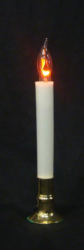 Christmas Flicker Flame Candle Lamp Item #D1304112 Color: clear bulb with orange flickering glow / white cord Bulb size: C7 Steady burning Convenient on/off switch Brass base Contains 1 plug with no end connector. Cannot be connected together with other lighted items Safety-fused plug for your protection UL listed for indoor use only 72 inch white lead cord 120 volts, 60 hertz, .008 amps, 1 watt Sits nicely on any flat surface, mounting accessories not included Dimensions: 8.75 inches high x 1.75 inches wide Material(s): plastic/glass bulb/wire