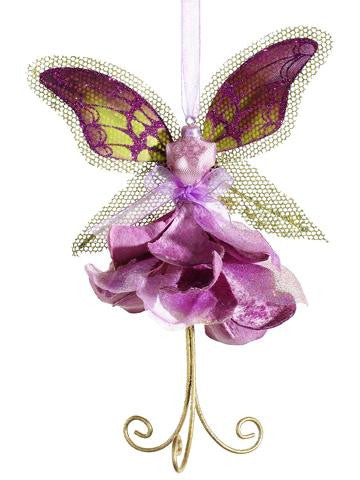 From the Princess Garden Collection Item #XM3039-PU/GR Add a touch of whimsy to your Christmas tree with this delicate and elegant fairy dress ornament. Soft purple dress is made up of gentle velveteen flower petals Fairy wings and gold stand are accented with glitter Fully dimensional ornament Comes ready-to-hang on a purple cord Dimensions: 8"H x 6"W (at widest point) Material(s): resin/velveteen/man-made materials