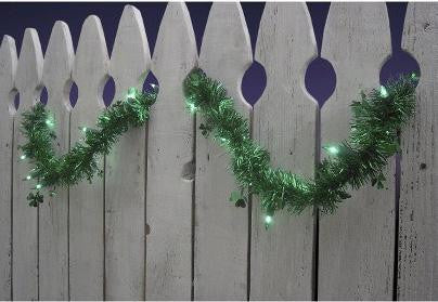 9 Foot Pre-Lit Green Shamrock Garland Item #56206711 Pre-lit green tinsel garland that is accent with various sized green shamrocks, perfect for St. Patrick's Day or Christmas! Product Features: Pre-lit with 50 green mini lights on green wire If one bulb burns out the rest will stay lit UL Listed for indoor/outdoor use Plug contains 1 end connector which allows you to connect multiple garlands (not to exceed 210 watts) 22 inch lead cord Comes with spare replacement bulbs and fuse 120 volts, 60 hertz, 0.17 amps, 20.4 watts Dimensions: 9 feet long x 1.75 inches wide Material(s): tinsel/glass bulbs/wire