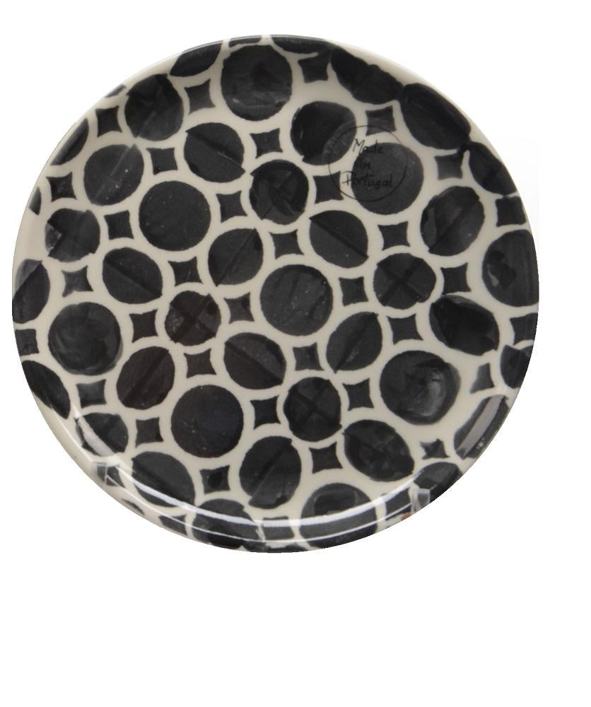 From the Basic Luxury Collection This unique and decorative round terracotta plate features white circles on a black background Dishwasher, microwave and food safe Ovenproof Made in Portugal Dimensions: 0.75" high x 6.5" diameter Material(s): terracotta