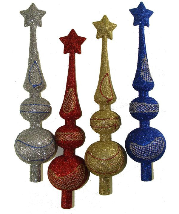 Pack of 72 Finial Christmas Tree Toppers Item #21667 Tree toppers are drenched in sparkling red, blue, gold and silver glitter Finials have hollow bottoms Dimensions: 11"H x 2.5"W (at widest point) Material(s): plastic/glitter Pack of 72 finials - includes 18 of each style shown