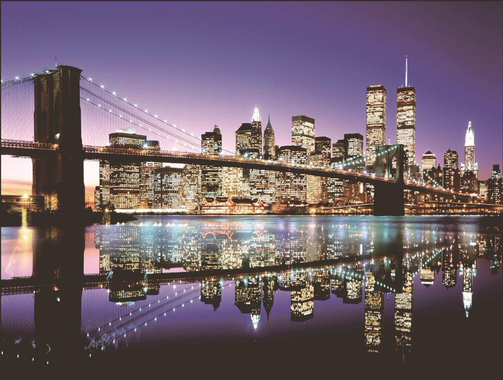A beautiful depiction of the famous NYC Brooklyn Bridge at dusk with the skyline of the city and a reflection of the city and bridge in the water The bridge and skyline is illuminated from behind the canvas by 16 LED lights Comes ready-to-hang with hooks on the back Convenient on/off switch on the side Requires (3) "AA" size batteries - not included For indoor use only Dimensions: 15.75"H x 39.25"W x .75"D Material(s): canvas/wood/MDF (medium-density fiberboard)