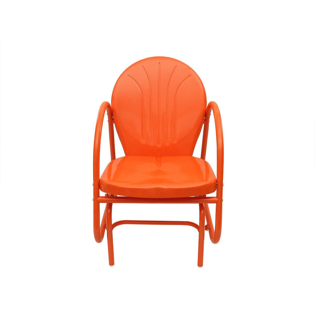 Color: orange Long lasting enamel paint Powder coated finish 250 pound weight limit 5-piece easy assembly All weather resistant For indoor/outdoor use Dimensions: 34"H x 21.5"W x 31"D (entire glider) 19"W x 19"D (seat size) 21"H x 19"W (back of seat size) Material(s): steel/plastic
