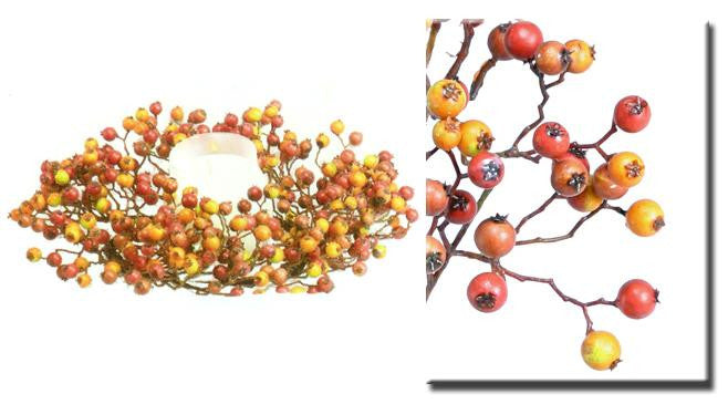 Pack Of 2 Artificial Berry Candle Rings From The Outdoor Fall Gooseberry Collection Item #P776007 Candle rings add elegance and class to any room, you can use them with jar candles, pillar or votive candles. Simply place your candle in the middle of the ring and voila, you have a beautiful decoration for your home in seconds! Product Features: Color: yellow and orange tones Dimensions: actual twine ring center is 7 inches in diameter, diameter when fluffed out is 16 inches, berries are approx. 0.25" (7mm) in diameter (about the size of a blueberry) Material(s): plastic/foam Weather resistant, these items have been treated with a special glossy finish and are suitable for indoor or outdoor use to prevent fading. Pack includes 2 of the candle ring shown Candles not included