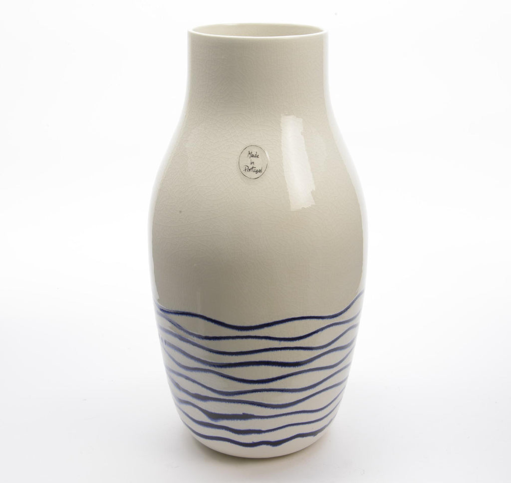 From the Seaside Treasures Collection With stripes that look like waves and a crackle finish that lends an antique look this vase will add a classic touch to any decor Ideal for artificial floral arrangements or tall fresh cut flowers such as gladiolus, sunflowers, calla lilies and more Opening is 5" in diameter Dimensions: 14"H x 8.25" diameter (at the widest point) Material(s): earthenware