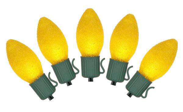 Set of 10 Battery Operated LED Christmas Lights Item #X103117 Features: Color: yellow sugared bulbs / green wire Bulbs are covered in a candy-like sugar coating Number of bulbs on string: 10 Bulb size: C7 light covers over small mini bulbs Light covers securely screw on and off Steady burning bulbs Spacing between each bulb: 12 inches Lighted string length: 9 feet (2.74m) Total string length: 11 feet (3.35m) Additional Product Features: If one bulb goes out the rest will stay lit Bulbs stay cool to the touch Energy efficient bulbs will last tens of thousands of hours Super bright bulbs guaranteed to light Each light has a clip on their base so you can easily attach the lights to your tree or other desired surfaces For indoor use only Cannot connect multiple sets together Comes with spare replacement bulbs and screw for battery pack Black battery pack is located at the end of the string and measures 2.75 inches long x 1.75 inches wide x .5 inches deep Requires 3 "AA" batteries - not included Standard batteries last approximately 72 hours before they need to be replaced - bulbs themselves will last tens of thousands of hours Convenient on/off switch on side of battery pack Material(s): durable plastic light covers and bulbs/wire