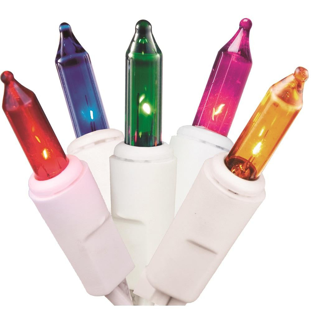 Set of 100 Mini Icicle Christmas Lights Item #284B4211 Features: Color: multi bulbs / white wire Multi-color consists of: red, pink, blue, green and yellow Number of bulbs on string: 100 Bulb size: mini Approximate drop lengths alternate between: 13 inches, 9 inches, 19 inches and 15 inches long Spacing between each bulb: 2.5 inches Spacing between each drop: 4 inches Approximate lighted length: 5.5 feet long Approximate total length: 7 feet long Additional product features: If one bulb burns out, the rest will stay lit End-to-end connectors allow you to connect multiple sets together (not to exceed 210 watts) Wire gauge: 22 Comes with replacement bulbs and fuse UL listed for indoor/outdoor use 120 volts, 60 hertz, 0.34 hertz, 40.8 watts