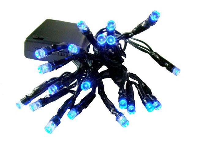 Set of 20 Battery Operated LED Christmas Lights Item #24172411 Features: Color: blue bulbs / green wire Number of bulbs on string: 20 Bulb size: concave wide angle nub (mini bulb) Spacing between each bulb: 4 inches Lighted string length: 6.25 feet Total string length: 8 feet Additional product features: Uses 90% less energy Super bright bulbs guaranteed to light Cool to touch, non-glass bulbs UL listed for indoor use only Straight line construction Non-replaceable bulbs Requires 3 "AA" size batteries (not included) Standard batteries last approximately 72 hours before they need to be replaced - bulbs themselves will last tens of thousands of hours On/off switch located on back of battery pack Cannot connect multiple sets together Material(s): plastic bulbs/wire