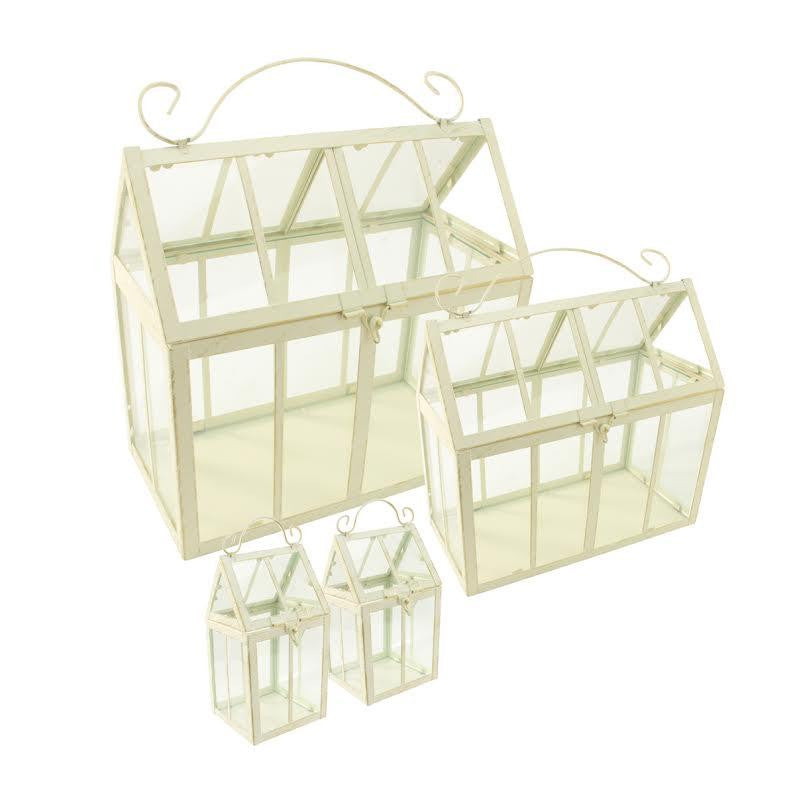 The classic straight lines of these terrariums add a touch of sophisticated style without detracting from the beauty of your plants The charming metal frames on these greenhouses are predominantly antique-white with subtle antique-gold colored brush strokes Scrolling handles featured on each lid are convenient for use as hanging hooks Each opens and closes with a latch Nesting style allows for convenient storage when not in use Greenhouses do not have any drainage for water but can be used as terrariums, table top decorations or you can put planters with drainage inside the greenhouses Dimensions: Small: 8.25"H x 4"W x 4.25"D Medium: 10"H x 10"W x 5.5"D Large: 12"H x 12"W x 6.5"D Material(s): glass/metal