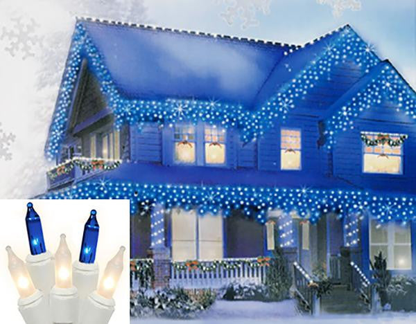 Features: Color: blue and frosted clear bulbs / white wire Number of bulbs on string: 100 Bulb size: mini Approximate drop lengths alternate between: 13", 9", 19" and 15" long Spacing between each bulb: 2.5" Spacing between each drop: 4" Approximate lighted length: 5.5' Approximate total length: 7' 12" lead cord 2.5" tail cord Additional product features: If one bulb burns out, the rest will stay lit End-to-end connectors allow you to connect multiple sets together (not to exceed 210 watts) Comes with replacement bulbs and spare fuses UL listed for indoor/outdoor use Wire gauge: 22 120 volts, 60 hertz, 0.34 hertz, 40.8 watts